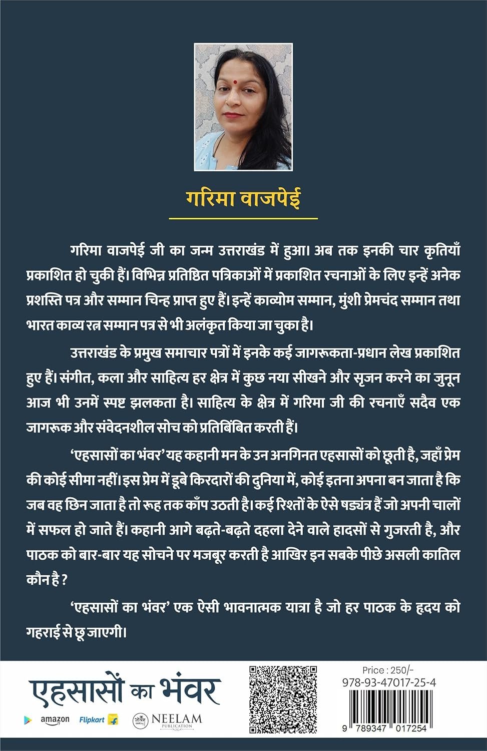 यह कहानी भले ही काल्पनिक हो, पर जब भी कोई पाठक इसे पढ़ेगा, यह उसके हृदय को अवश्य स्पर्श करेगी। यह एक निश्चल, खूबसूरत और अटूट प्रेम की कथा है जहां अथाह प्रेम है और किस्मत भी उसे मिलाती है मगर किसी के छल के कारण वही प्रेम हमेशा के लिए बिछड़ जाता है। मजबूरी में उठाए गए कुछ कदम जीवन की नींव हिला देंगे। कई रहस्यमय पहलू सामने आएंगे जो आपकी कल्पनाओं से परे होंगे। आज के समय में जब लोगों के मन में छल और कपट पनप रहा है तब भी प्रेम अपनी निष्ठा और सच्चाई के साथ आगे बढ़ता रहेगा। मैं अपने पाठकों से यही कहना चाहूंगी कि इस कहानी को एक बार अवश्य पढ़ें | यह न केवल आपके हृदय को छुएगी, बल्कि समाज की कई गलत धारणाओं को भी बदलने का प्रयास करेगी। जीवन में चाहे कितने भी संकट क्यों न आएं, एक नई सोच के साथ संघर्ष करते रहना ही सच्चा जीवन है। यही सोच, यही जज़्बा हमारे उज्ज्वल भविष्य की सबसे बड़ी भूमिका निभाता है।